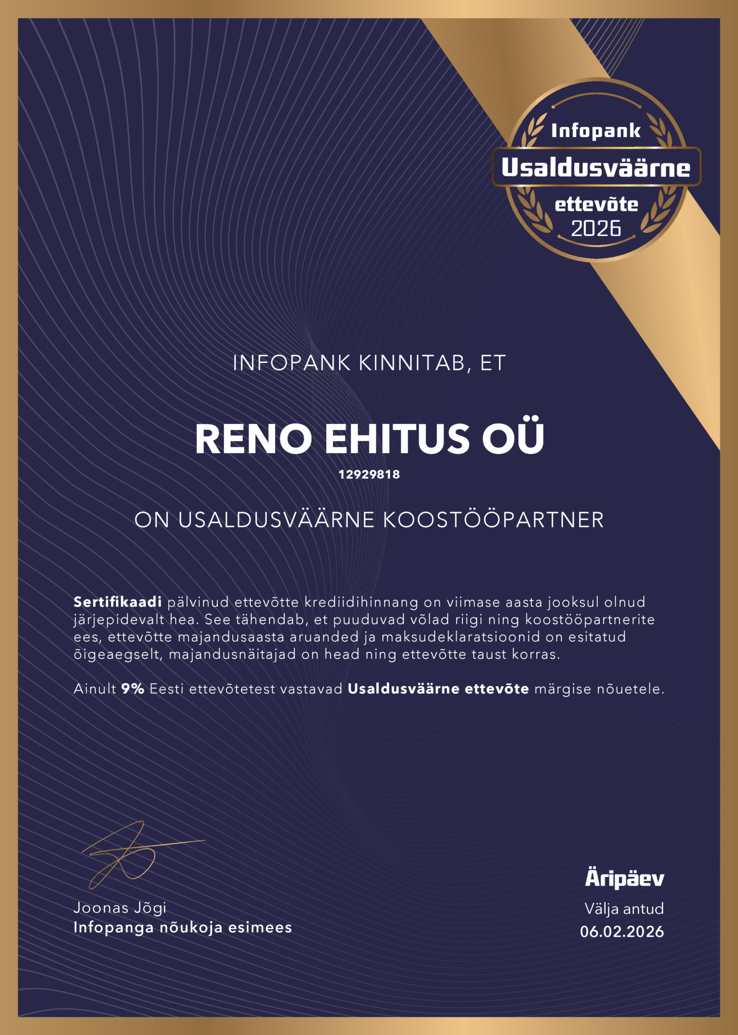 RENO EHITUS OÜ on pälvinud Usaldusväärne Ettevõte sertifikaadi neljal järjestikkusel aastal